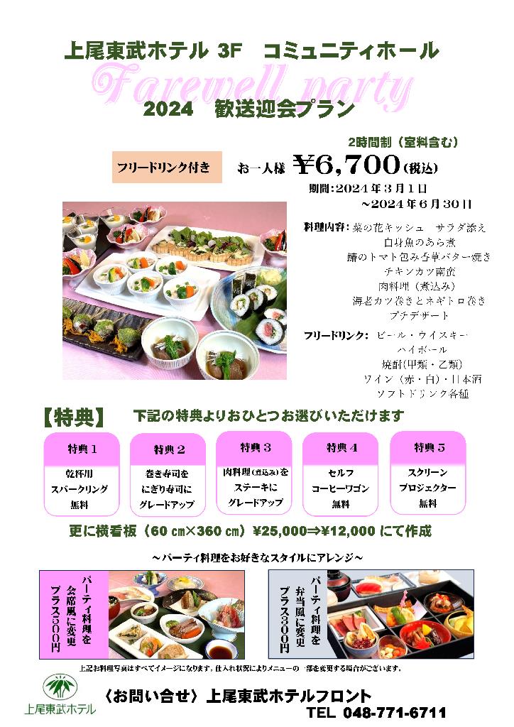 2024.02.16 上尾東武ホテル3階【コミュニティーホール】にて新メニュープラン販売を開始しました。 お知らせ 東武食品サービス株式会社(東京都墨田区)で営業をしているJR高崎線上尾駅東口徒歩1分【上尾東武ホテルコミュニティーホール】にて、新メニュープランの販売を開始いたしました。 フリードリンク付き室料込み2時間制のコースとなっております。またメニュー内容はお好きなスタイルに変更可能です。 ※ご予約頂きましたお客様には5つの特典よりおひとつお選びいただけます。 詳しい内容はこちらをご覧ください。 公式HPはこちら 従業員一同、心を込めた料理を準備してお待ちしておりますので、ぜひご利用ください。 常磐自動車道友部サービスエリア上り線『ハイウエイめし甲子園』の決勝大会進出が決まりました! 前の記事 山海亭の商標登録完了のお知らせ 次の記事 関連記事 東武動物公園内レストランWinter Illumination 2025-2026Special Menuのご紹介 『そばまる』が獨協大学前駅(草加松原駅)東口に2025年2月17日改装オープン 常磐自動車道友部サービスエリア上り線『ハイウエイめし甲子園』の決勝大会進出が決まりました! 最近の記事 カップデリサンクは11月30日に閉店しました。 社内懇親会を開催しました 東武動物公園内レストランWinter Illumination 2025-2026Special Menuのご紹介 カテゴリー OPEN カテゴリー お知らせ 採用情報 新規出店情報 TV放映 新商品情報 アーカイブ OPEN アーカイブ 2025年12月 2025年11月 2025年10月 2025年9月 2025年8月 2025年7月 2025年6月 2025年5月 2025年4月 2025年3月 2025年2月 2025年1月 2024年12月 2024年11月 2024年10月 2024年9月 2024年8月 2024年7月 2024年6月 2024年5月 2024年4月 2024年3月 2024年2月 2024年1月 2023年12月 2023年11月 2023年10月 2023年3月 2023年2月 検索 検索: