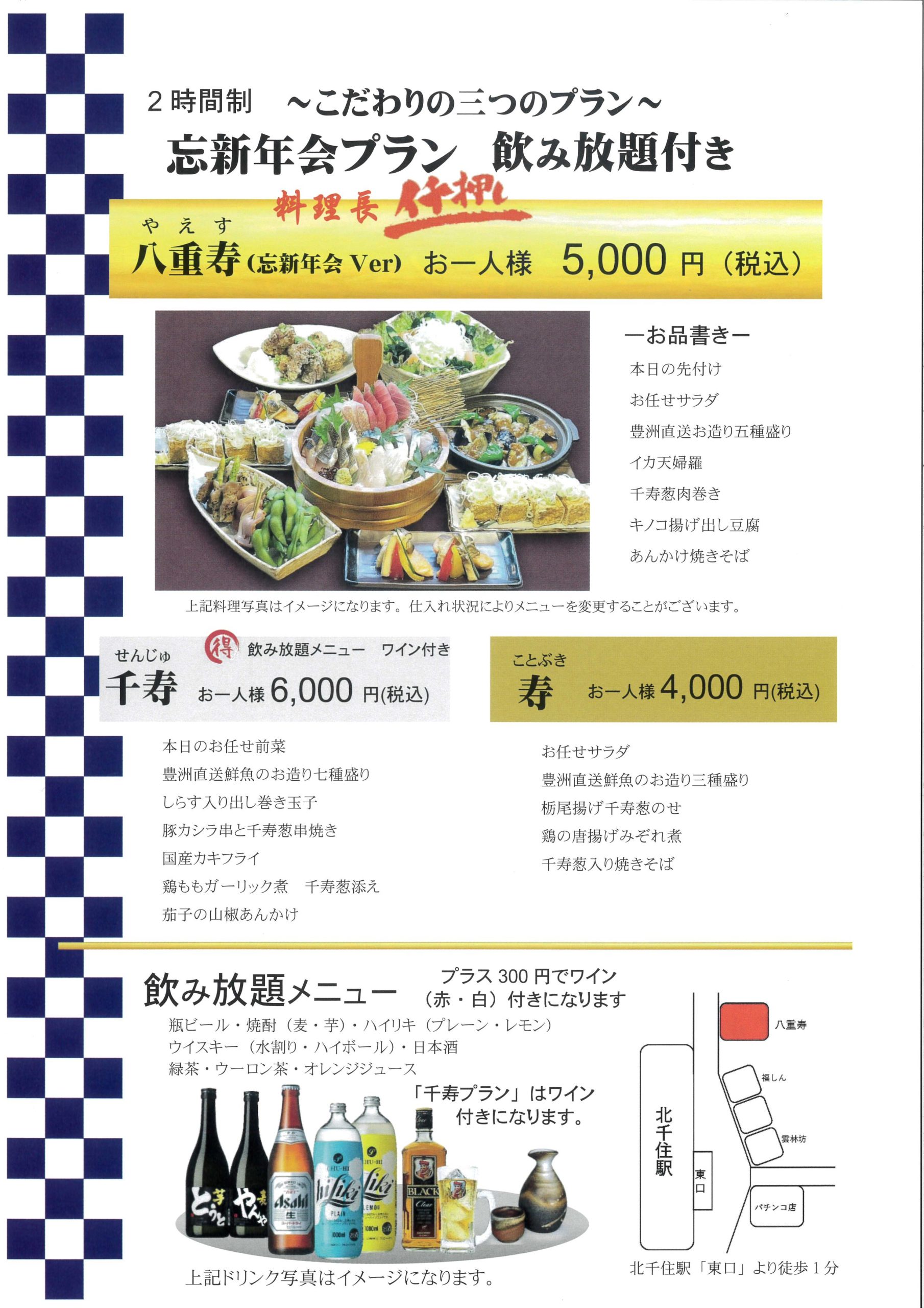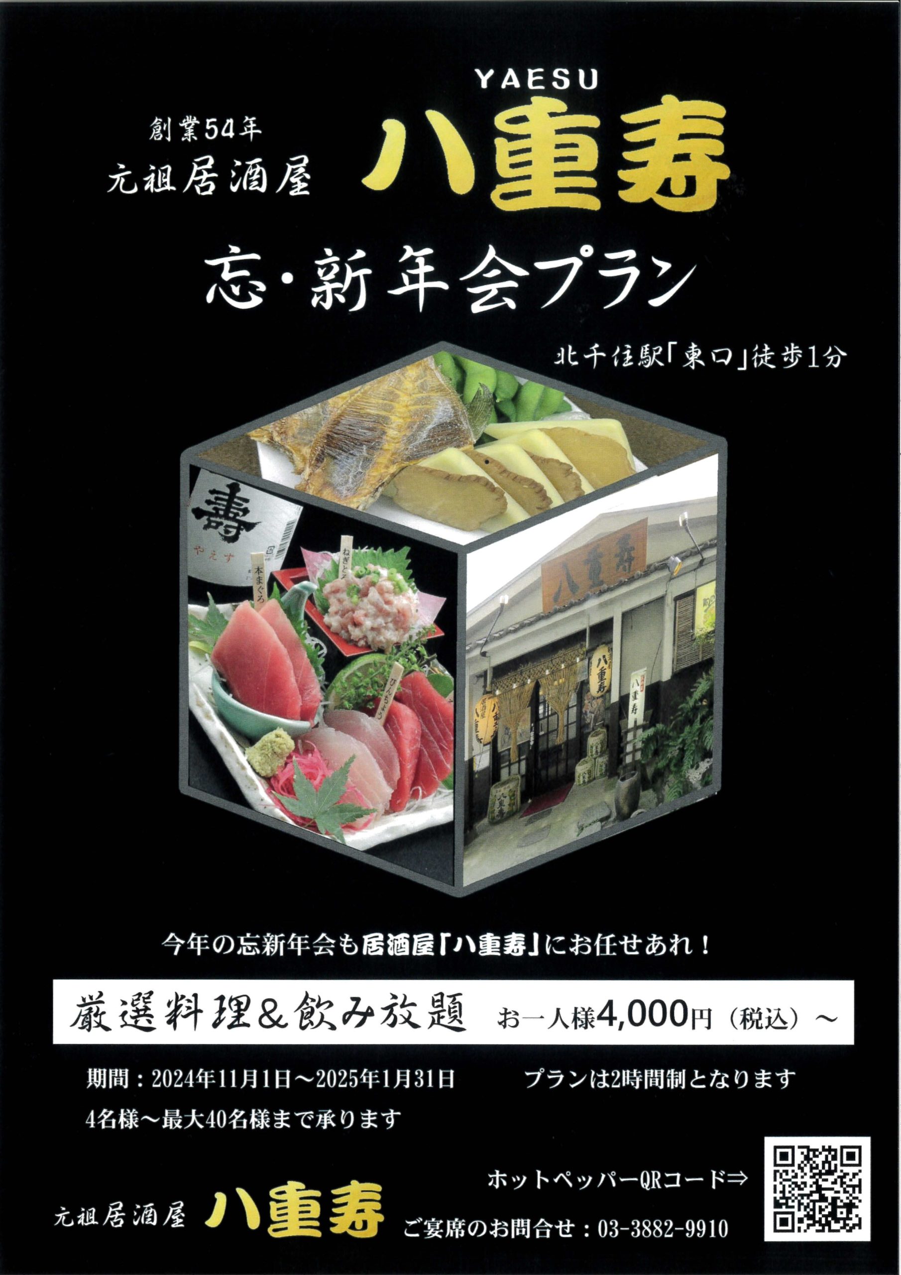 東武食品サービス株式会社(東京都墨田区)で営業をしている東武北千住駅東口徒歩1分の【居酒屋八重寿】では、特別料理と飲み放題含めた忘新年会プランの販売を開始いたしました。