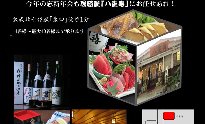 東武食品サービス株式会社(東京都墨田区)で営業をしている東武北千住駅東口徒歩1分の【居酒屋八重寿】では、特別料理と飲み放題含めた忘新年会プランの販売を開始いたしました。