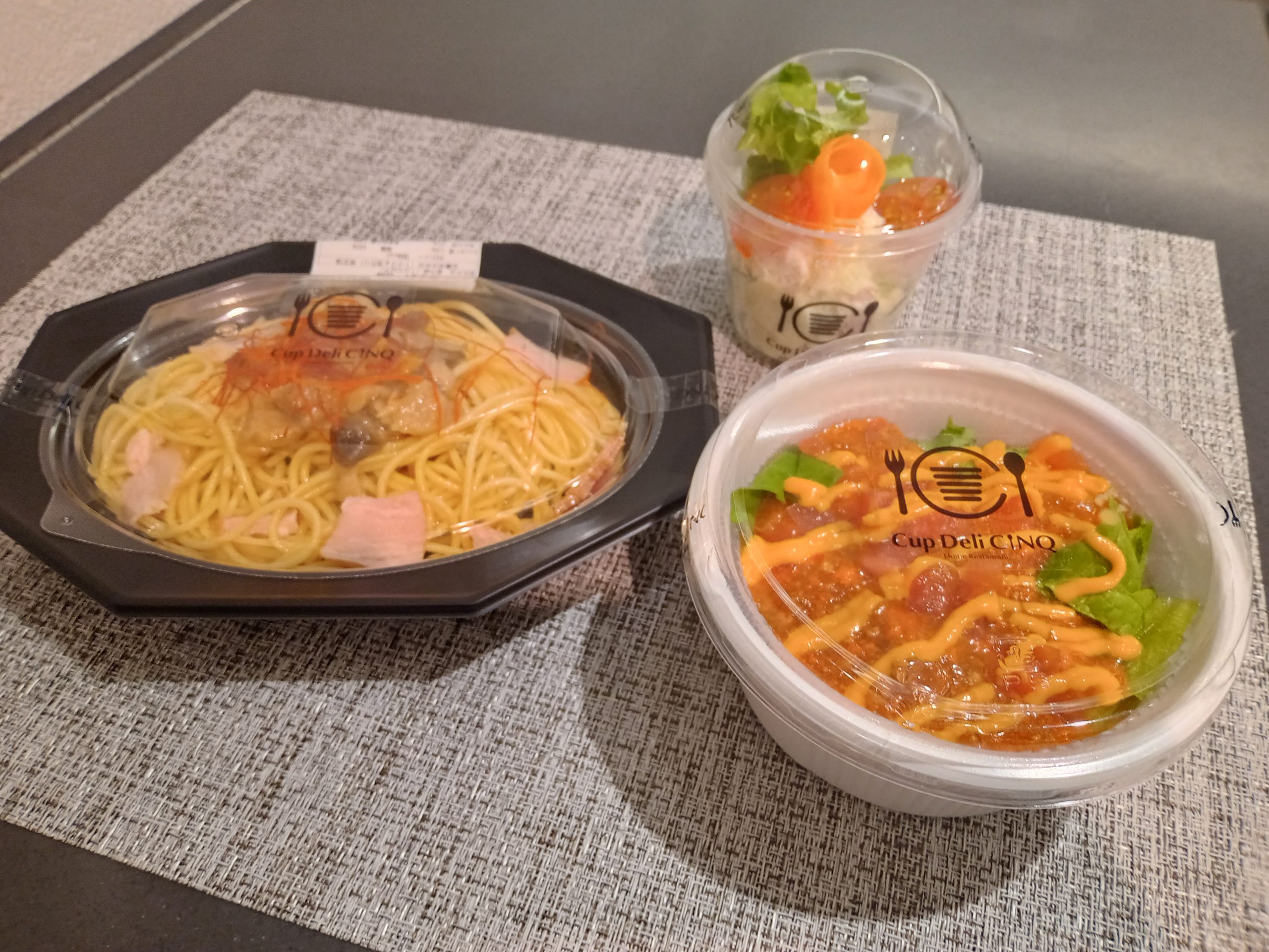 ※左からきのこのペペロンチーノ・ポテトサラダ・タコライス