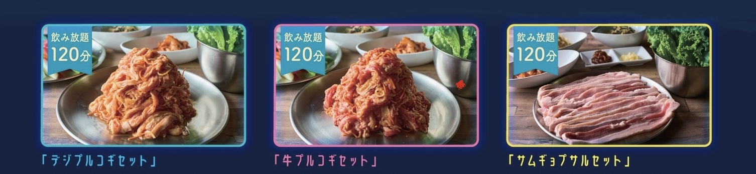 今年は120分飲み放題付で『プルコギ』・『デジプルコギ』・『サムギョプサル』の3セットをご用意し、