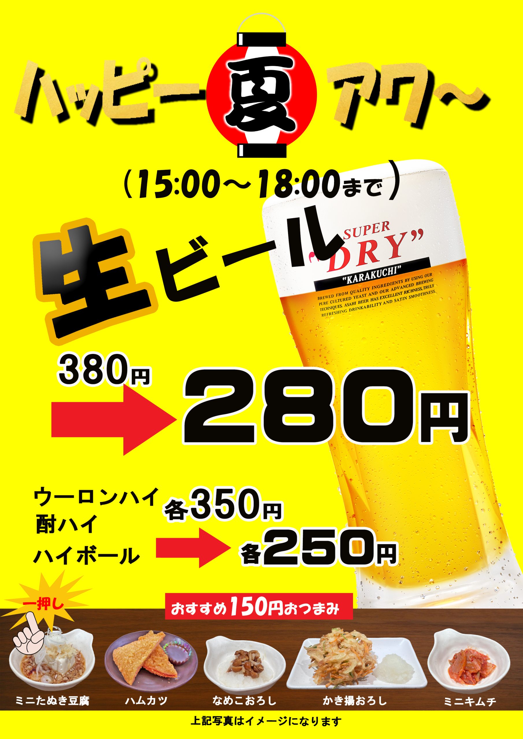 本日2025年8月1日より、15:00~18:00の時間限定で生ビールを1杯280円、ウーロンハイ・酎ハイ・ハイボールを1杯250円で販売します。